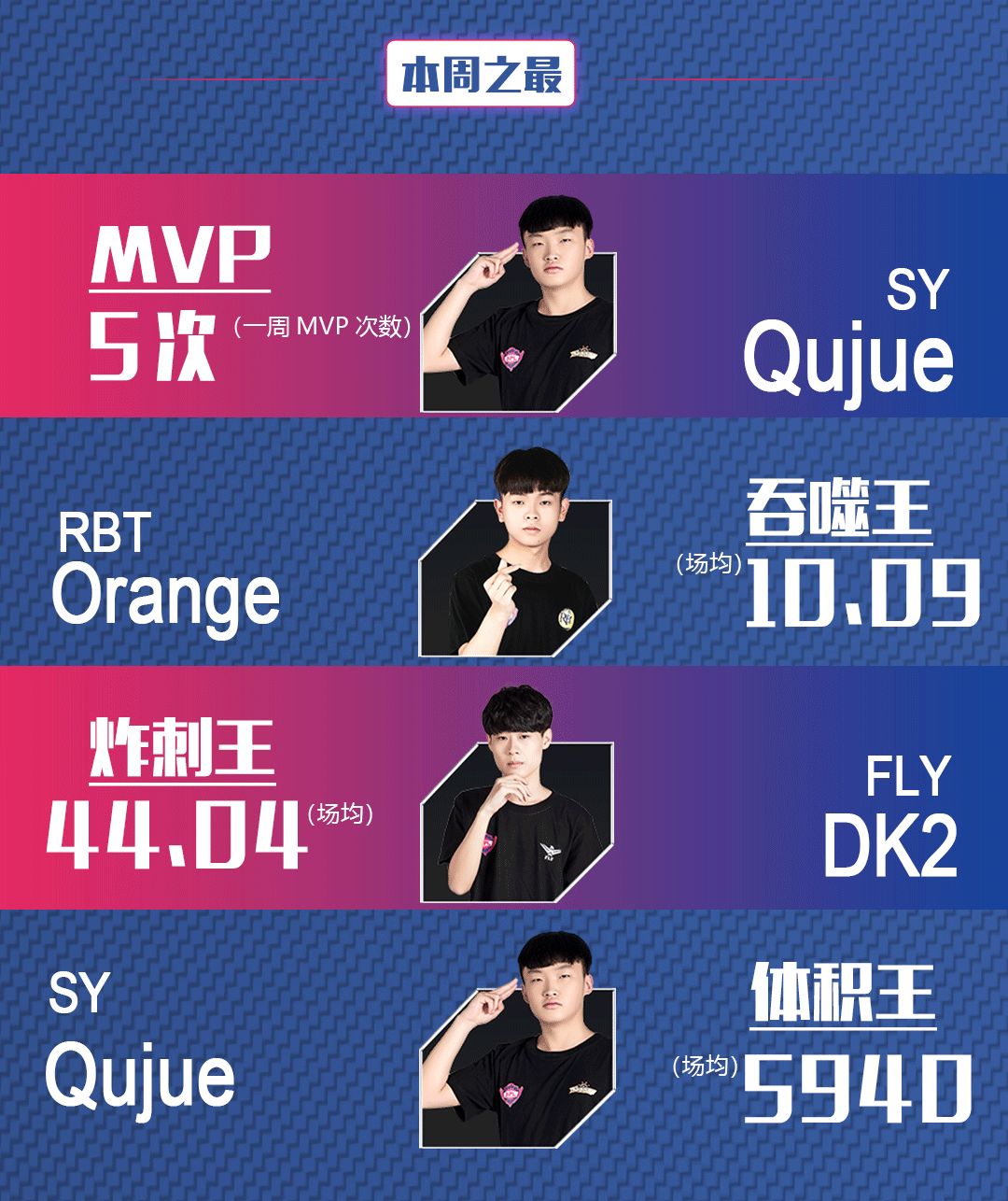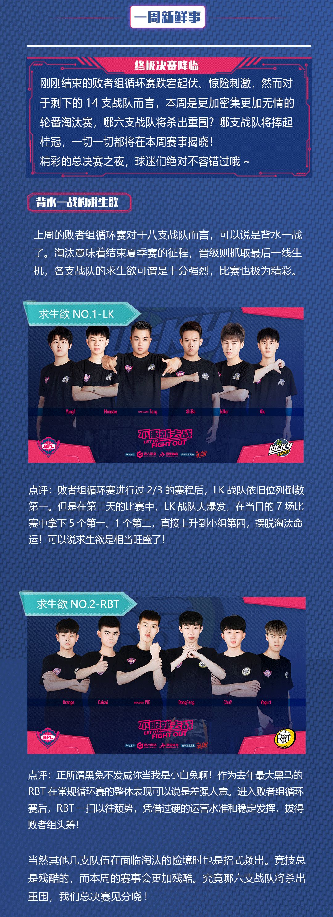 上一周败者组循环赛的比赛结束后,RBT、FLY、SY、LK、CMD、AY这六支战队顺利晋级,但这仅仅只是个开始。要想冲进最终的决赛,在第八周前两天的比赛日中,败者组的队伍需要经历三轮淘汰赛的考验,这对于战队而言,不仅需要选手们在赛场上斗智斗勇,还是一场体力与耐力的较量。