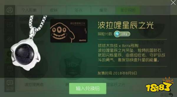 点击游戏主界面左上角头像,进入个人主页-皮肤-星空探险,点击“波拉哩星辰之光”并输入兑换码即可成功兑换。