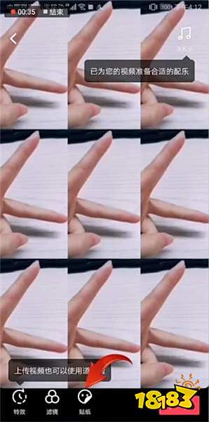 打开【抖音】,然后拍摄一段视频作品,接着在添加贴纸页面,点击【贴纸】图标,