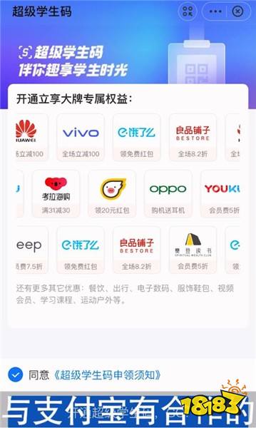 超级学生码是支付宝针对学生群体提供的身份认证信息,用户领取后可以在支付宝、以及部分与支付宝有合作的商家使用,证明学生身份,获取相应的优惠信息,参与优惠活动。