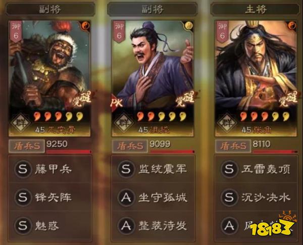 兀突骨:锋矢阵+魅惑(全统);无战而胜+守势+铁甲
