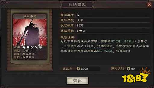 对敌军单体造成兵刃伤害及禁疗效果,持续3回合,并使有负面状态的友军自带的单体战法发动率提高,持续1回合。
