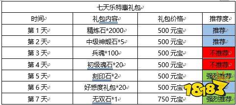 10:七日目标最边上还有一个特惠礼包,内容参差不齐,在此本人整理了一个性价比推荐(主要按照获取难度及成本估算),供各位参考:
