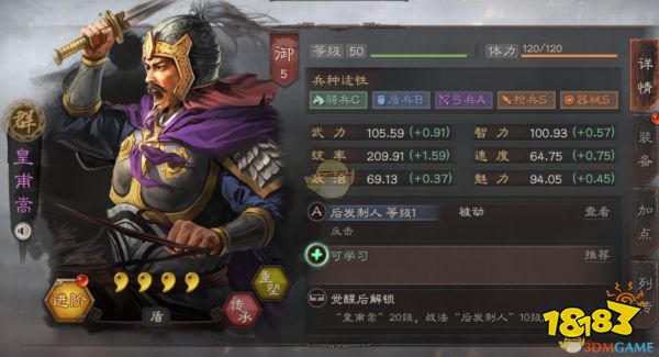 百炼成钢:使自己武力、智力、统率、速度属性提升。(4种属性对皇甫嵩都有用)