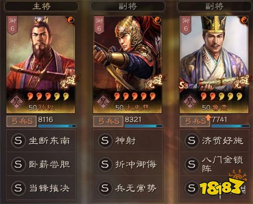 兵书:孙权、太史慈兵书都一样,因为他俩都是普攻怪,兵书胜而益强为他们提供续航;胜战兵书打第二回合爆发,执锐是为了进一步提高伤害;鲁肃…既然他自己有暂避其锋的兵刃减伤buff,那就带驰援帮队友抗一抗~