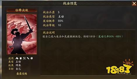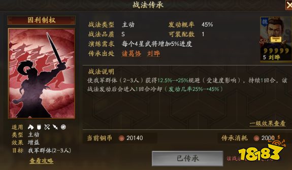 使我军群体(2-3人)获得12.5%- +25%规避(受速度影响),持续1回合,该战法发动后会进入1回合冷却( 发动几率25%- +45% )