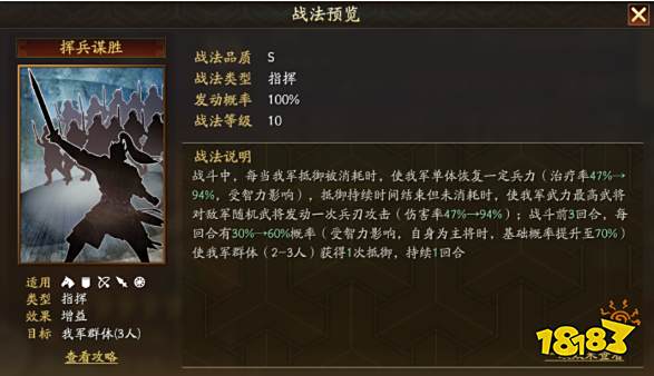 4.诸葛恪的自带战法【挥兵谋胜】围绕抵御状态,效果颇为丰富。首先,在战斗的前3回合,诸葛恪有概率为我军群体施加抵御状态,为我军抵挡大量伤害。