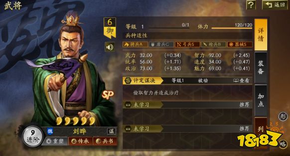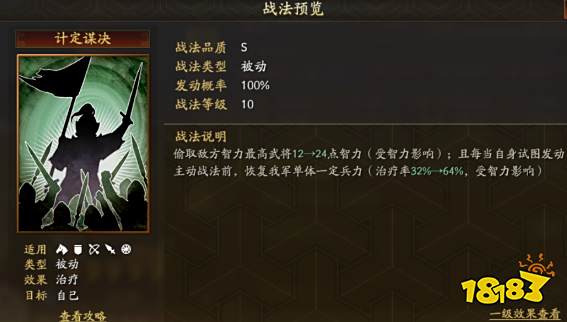 2.SP刘晔的自带战法【计定谋决】具有强大的辅助能力:在准备阶段即可削弱敌方智力最高的武将,大大限制了传统单核阵容的发挥;并且搭配主动战法时,还能提供源源不断的治疗效果。