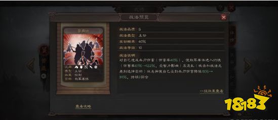 对自己造成40%的兵刃伤害,使敌军单体进入灼烧(伤害率122%,受智力影响)及混乱状态,并使自己受到的兵刃伤害减低30%,持续2回合。