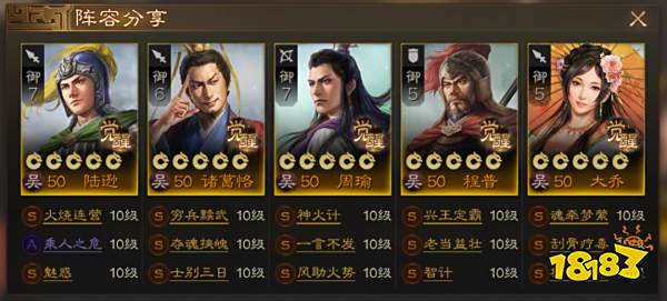 而火烧队更讲究团队配合,以周瑜陆逊为核心的吴国火烧队最高可叠8层“灼烧”,让首领在每回合结算时被造成大量灼烧伤害,另外,可考虑加入诸葛恪,利用首领身上的多异常状态打出高额的伤害!
