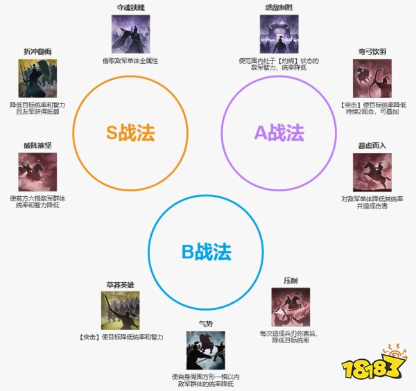 从上图中我们可以看到,游戏中ABS品质都有降低目标统率的战法,灵活搭配特性武将和战法,能把首领统率降到冰点,顺利拿下高分;