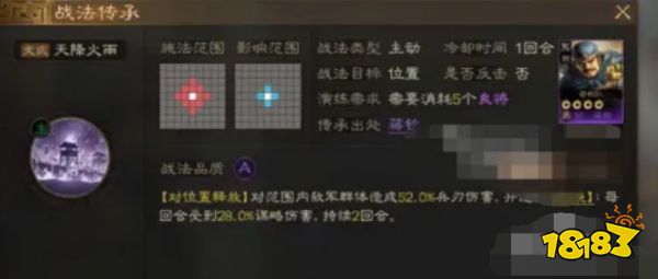 效果:对敌军单体造成60%谋略伤害,并对目标方形一格内敌军连续传递火焰,造成40%谋略伤害和2回合灼烧:每回合受到20%谋略伤害,可叠加。火焰最多传递4次。