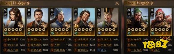 1、核心输出诸葛亮携带【工神】和【杯蛇鬼车】进一步提高自身谋伤和持续作战能力;2、二号位输出庞统则携带【太平道法】和【智识过人】把“铁索连环”作用发挥到最大;3、荀彧带上【谈心】战法,给核心输出诸葛亮提供高属性;4、黄月英【奇门遁甲】可提供超大范围的伤害和免伤提升法阵5、桃园三兄弟刘备、张飞、关羽则顶在前排吸引火力、聚集敌军;6、黄月英研习<大戟士>高级枪兵(射程增强)和庞统研习<白马义从>高级弓兵(机动加强)更灵活释放出关键战法;