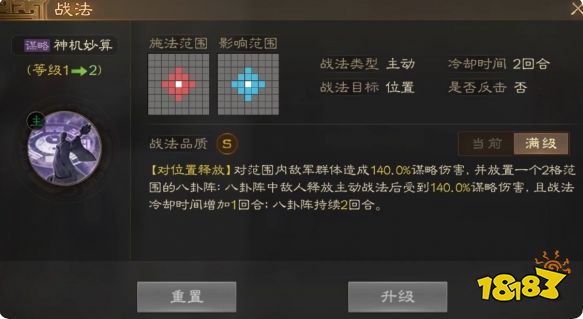 对范围内敌军群体造成61%~122%谋略伤害,并放置一个2格范围的八卦阵:八卦阵中敌人释放主动战法后受到61%~122%谋略伤害,且战法冷却时间增加1回合;八卦阵持续2回合。