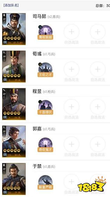 郝昭替代于禁(上曹操的话)。战法:权时救急+倾国。同时荀彧战法变更为谈心+刮骨/献图