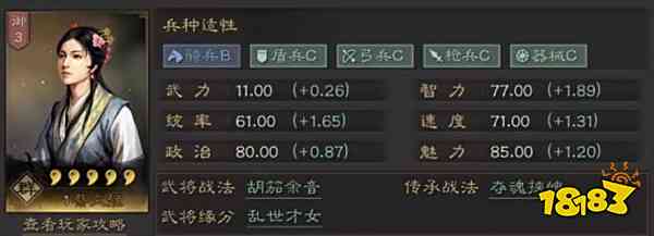 蔡文姬,原名蔡琰,字文姬,陈留郡圉县人,东汉时期女性文学家。她的主要成就是首次创造五言体长篇自传叙事诗。而在《三国志战略版》这款游戏中蔡文姬是一名恢复型的辅助。我们可以看到蔡文姬的兵种属性是相当低的,但有一点值得提的就是蔡文姬所需要的统御值只要3,这在前期我们统御值低的时候我们就可以非常灵活的搭配统御值高的武将。其次蔡文姬的智力是比较不错的。