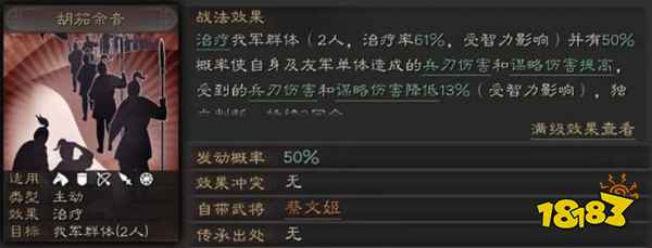 刮骨疗毒、杯蛇鬼车、暂避其锋、八门金锁阵、挫锐。蔡文姬自带的战法胡笳余音,是一款治疗型的战法,能够为我军两人进行治疗(受智力的影响,建议主加智力),胡笳余音不仅能够有治疗的效果还能使我军的兵刃伤害和谋略伤害的输出提高,所受伤害降低。