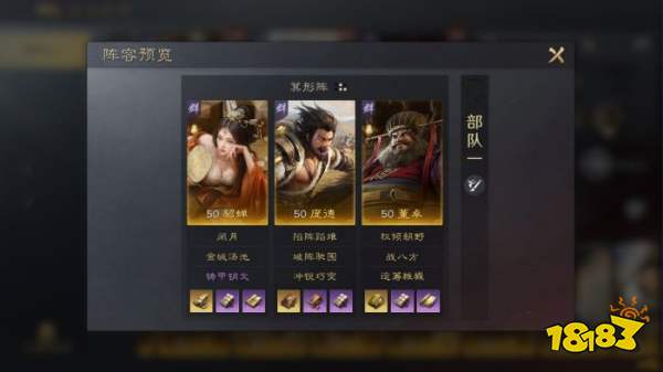 董卓的自带战法【权倾朝野】吸取统率值,造成文武伤害,破除抵御效果,貂蝉携带战法【金城汤池】给全体施加抵御效果,庞德携带【破阵驰围】和【冲锐巧变】可以跳过战法的准备阶段造成高额的兵刃输出。