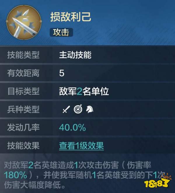 对敌军2名英雄造成1次攻击伤害(伤害率90%-180%),并使我军随机1名英雄受到的下1次伤害大幅度降低。