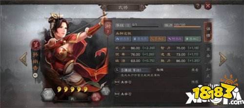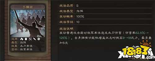 发动普通攻击之前会对敌人单体敌人造成兵刃伤害,伤害是在百分62.5到百分125之间,自身加buff增益的时候,可以提升9到18点的物攻。从技能就可以看出来孙尚香是一位物理输出类型的武将,在战法满级且叠满5次的情况下还可以增加90点的物理,而且每一个回合还可以触发一次百分125加成的兵刃伤害。