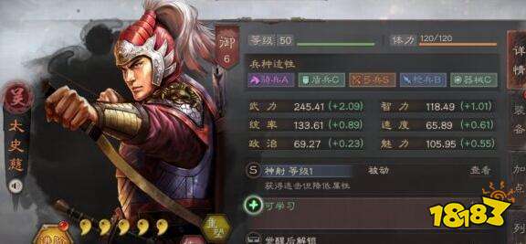太史慈的技能为神射,效果是让自己获得连击但是统率也会有所降低哦,虽然降低了统率但是太史慈的伤害和辅助效果得到了提升,玩家们在前期选择这个角色是非常不错的。战法推荐大家使用暴戾五仁、弯弓饮羽、手起刀落,要是这些你觉得不太好的话也可以换成一骑当千、百骑劫营和暗藏玄机,这些战法玩家们自己去搭配就可以了,并没有什么太多的规定。