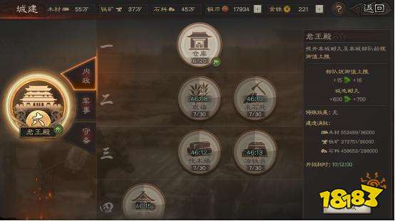而分城君王殿升到10级以后,可以建设圆丘坛,可以提升主公的领地上限,可以说是非常好用的一个功能。2500点的声望额外加成,可以享受多占领25个资源地,对于后期玩家来说战略意义非凡。