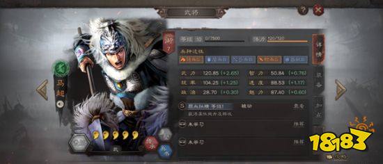 陈寿称其:阻戎负勇。马超在游戏中有着十分优秀的武力以及速度,能够打出很不错的伤害以及有着不错的出手时机。可惜的是其统率和智力偏低,且自带战法的强度稍差,即使新战法裸衣血战的出现也不能提高马超的登场率。