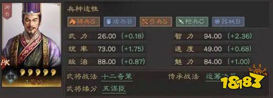 兵种适性上,弓骑双S刚刚好,这两个兵种适性是谋略武将最集中的地方,最能让荀攸大展拳脚。