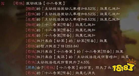 (1)该增益和第3点一样维持1回合,不可刷新,但可以叠加效果。只要荀攸一直施放十二奇策,并且队友期间没施放任何主动战法,那么【十二奇策】的伤害预备是叠加的,直到队友的主动战法一次引爆所以十二奇策预备的伤害。