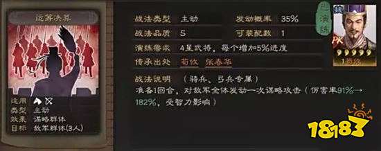 集输出与辅助效果于一身,具有削弱敌军、增加友军、造成伤害等多种特性,是五谋臣组合的最后一块拼图,不仅兵种合适,战法也合适,能形成完美的联动。无论是作为辅助还是输出,都非常合适与【舌战群儒】战法搭配使用,强化自身之余还能干扰敌军。因为战法输出部分需要依靠队友才能发动,所以队友是否学习有主动战法非常重要。