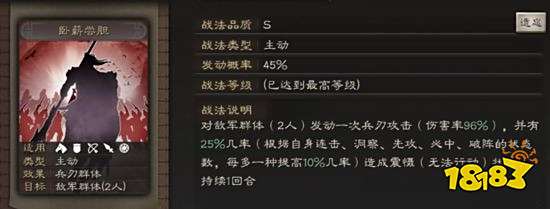 瞬发群体控制兵刃伤害战法,是兵刃战法中唯一可以和【横扫千军】相提并论的顶级战法。【卧薪尝胆】在伤害方面虽然不如【横扫千军】,但胜在控制更强,尤其是孙权装备上更是如虎添翼,因为孙权是唯一一个能使震慑概率达到75%的武将。