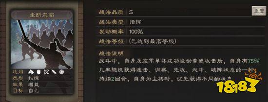 指挥类型,战斗中自身及友军单体成功发动普攻后,自身有75%几率获得连击(两次普攻)、洞察(免疫控制)、先攻(优先行动)、必中(无视规避、抵御)、破阵(造成伤害时无视统率和智力)状态的一种,持续2回合,自身为主将时优先获得不同状态。