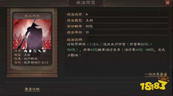 该战法有着强力的普攻特效,有一定几率获得群攻效果,且若已处于群攻效果,则提高一定武力,而其真正强力之处是可叠加的效果,在新赛季弓兵队本就不弱的情况下,配合强力的群攻战法,弓强势即将到来。