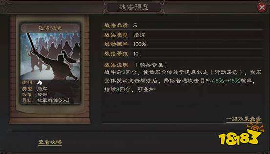 该战法是基于历史背景进行特性策划,先进入遇袭状态,行动滞后两回合,在我军发起突击战法后,降低敌方统率三回合,因为其战法强力的减防效果,让武将的伤害最大化,从而达到快速突破的目的,整体风格也像极了西凉铁骑的雷厉风行。