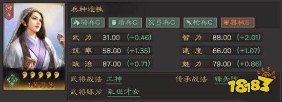 黄月英在属性上还是比较普通的,可以说没有太大的亮点,在五星武将里只能算是中规中矩,不过如今看到她只需要4御的话,那么在这类武将中就非常厉害了!当然了,由于黄月英的兵种基本都是C级,所以注定了她只能当工具人,不适合当输出类型的武将。