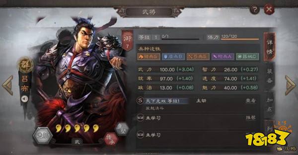 吕布的武力成长是游戏中最高的,达到了3.04的高度,当然智商就比较堪忧了,基本上可以忽略!在兵种上,吕布拥有超强的S级骑兵和S级弓兵,适合群骑和群弓阵容!