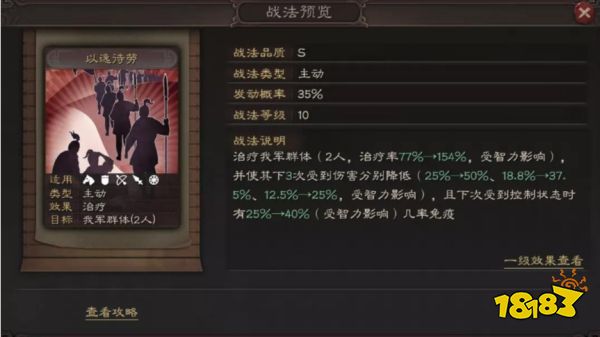 【以逸待劳】:随机治疗我军群体2人,并使其下3次受到伤害降低,且有几率免疫下次受到的控制状态。
