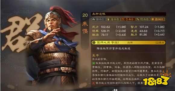 3、sp朱儁:战斗中,若敌军群体(2人)处于溃逃或叛逃状态时则压制敌军,使敌军造成的谋略伤害降低(该效果受智力影响且触发后每回合递减1/3),战斗第2回合,使敌军全体进入叛逃状态(受武力或智力最高一项影响,无视防御),持续2回合;自身为主将时,谋略伤害降低值有提升。