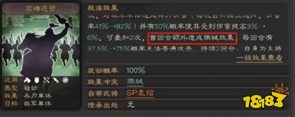 还能缴械。这里就要给大家解释一下,SP袁绍的自带战法高橹连营自带缴械,所以我们带盛期完全是多此一举,还多占了一个战法,那我们用上横扫既能补伤害,还能震慑!