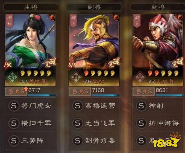 主将:关银屏 横扫千军+三势阵;兵书大谋+神机+将威