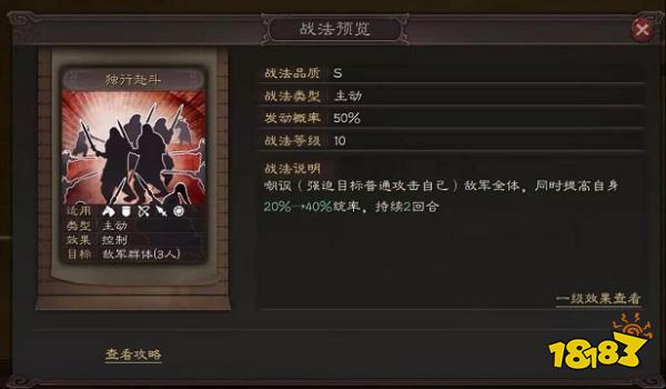 满红程昱达到45级全部智力加点的情况下太平道法能给他自带战法提高大概10%的发动几率,程昱只要能发动2次十面埋伏就不缺输出了。可以这样理解曹操全程给程昱增伤20%-30%,程昱兵书以治击乱增伤12%(夏侯惇独行赴斗控制二回合,程昱自带战法第二队禁疗)嘲讽禁疗都是控制状态。