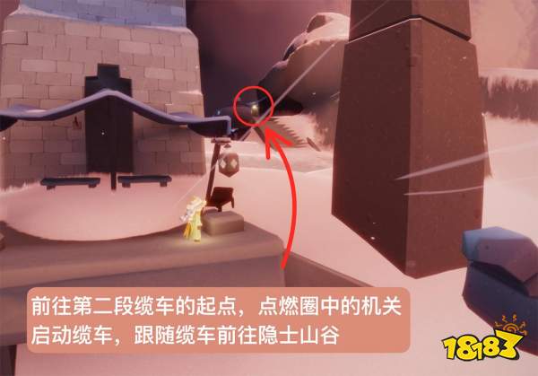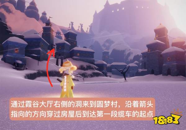 2、然后通过霞谷大厅右侧的洞,来到圆梦村,沿着箭头指向的方向,走到缆车起点;