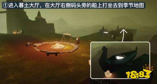 1、首先我们来到暮土大厅,在右侧码头坐船去季节地图。