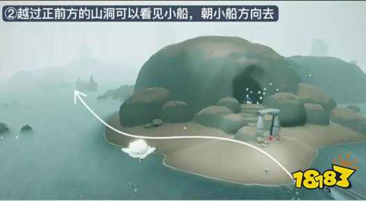 2、然后越过山洞即可看到小船,我们朝小船方向走去。