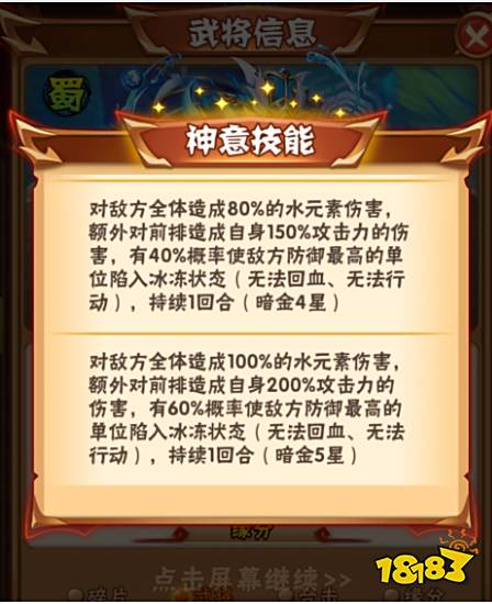 神意技:全体伤害、附加200%攻击力固伤、几率单人冰冻、全体3回合渐冻。