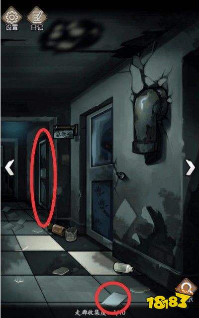 点击前面的门,安上把手,玩游戏开门(看广告开的),捡起门下面的红色密码牌。这个场景就结束了,可以转换场景了,但它下面的收集显示差一个,这个就要你点下方的日记本并且看日记(看广告,点日记中间看广告,不是观察的广告)