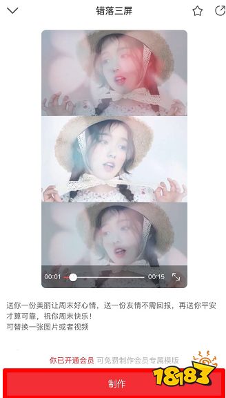 3、确认自己开通会员之后,再来点击“制作”按钮下载模板,导入手机本地的素材就可以制作出“错落三屏”的特效作品了!