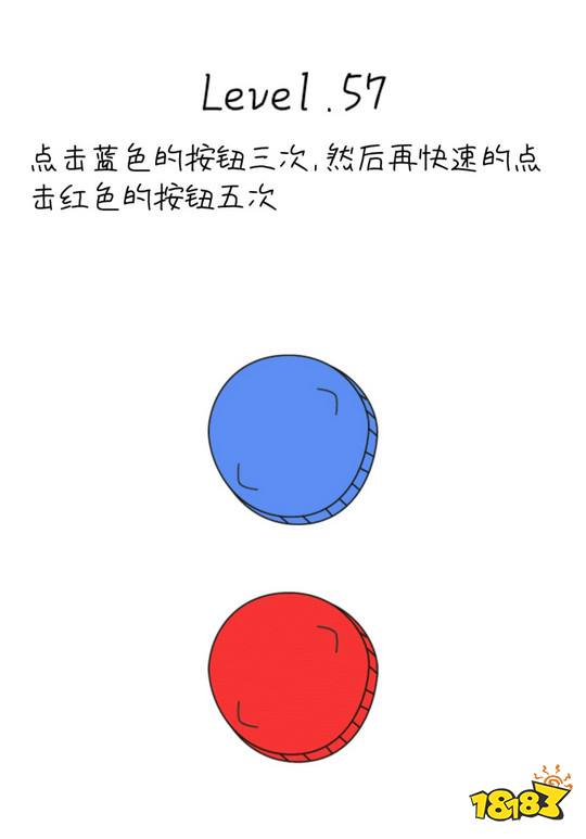 第57关攻略题目:点击蓝色的按钮三次,然后再快速的点击红色的按钮五次