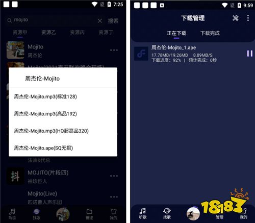 点击歌曲后的三个点可以进行下载,而且支持无损音质(如果下载不了,可以切换接口,个别歌曲可能解析不了)。在管理中可以查看下载进度和速度。
