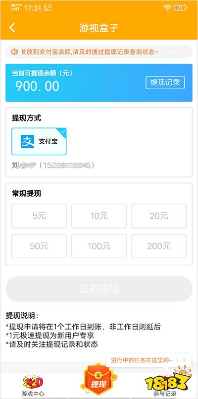 游视盒子提现特别方便,首次一元提现,点击最下方“提现”,会进入游视盒子的提现页面,如下图所示,我在游视盒子里玩游戏赚了些钱,提现多次了。